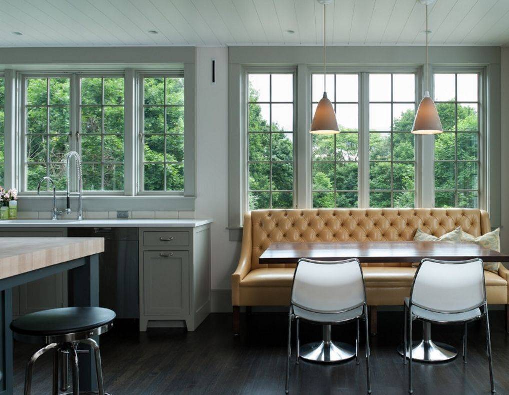 Может иметь прямую или угловую форму. Каркас дивана-скамейки чаще всего, выполняется в одном цветовом и стилевом решении с кухонным гарнитуром и в основном представляет собой деревянное основание, украшенное мягкими подушками для сидения.