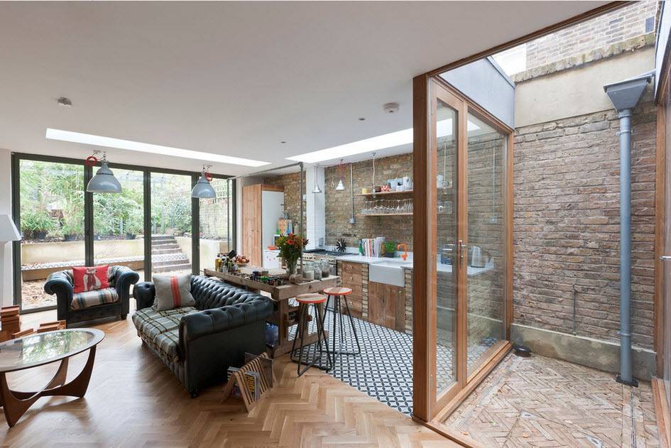 Можно позаимствовать один из приемов стиля лофт. Например, в самом обычном интерьере оформить стену за диваном под кирпич, дополнительно разместив на ней набор из черно-белых фотографий.