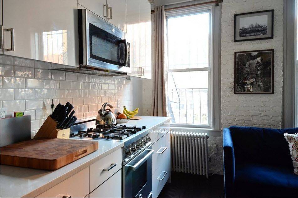 Небольшие прямые диваны гармонично смотреться на кухнях узкой планировки. Они бывают двух видов: со спальным местом и без него. Помните, что такие конструкции раскладываются по принципу «книжки» или выкатываться вперед. Второй вариант менее практичен, так как занимает много места в разложенном положении. Если у вас часто на ночлег остаются гости, стоит приобрести на кухню раскладной диван. Наиболее подходящей моделью станет «Евро – книжка». Ее механизм рассчитан на частое складывание и раскладывание. А под сиденьями есть место для хранения вещей.