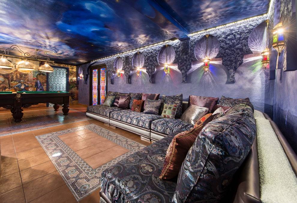 - В нарядном восточном стиле часто используется шелковая обивка с рисунком и мебель со множеством деталей.