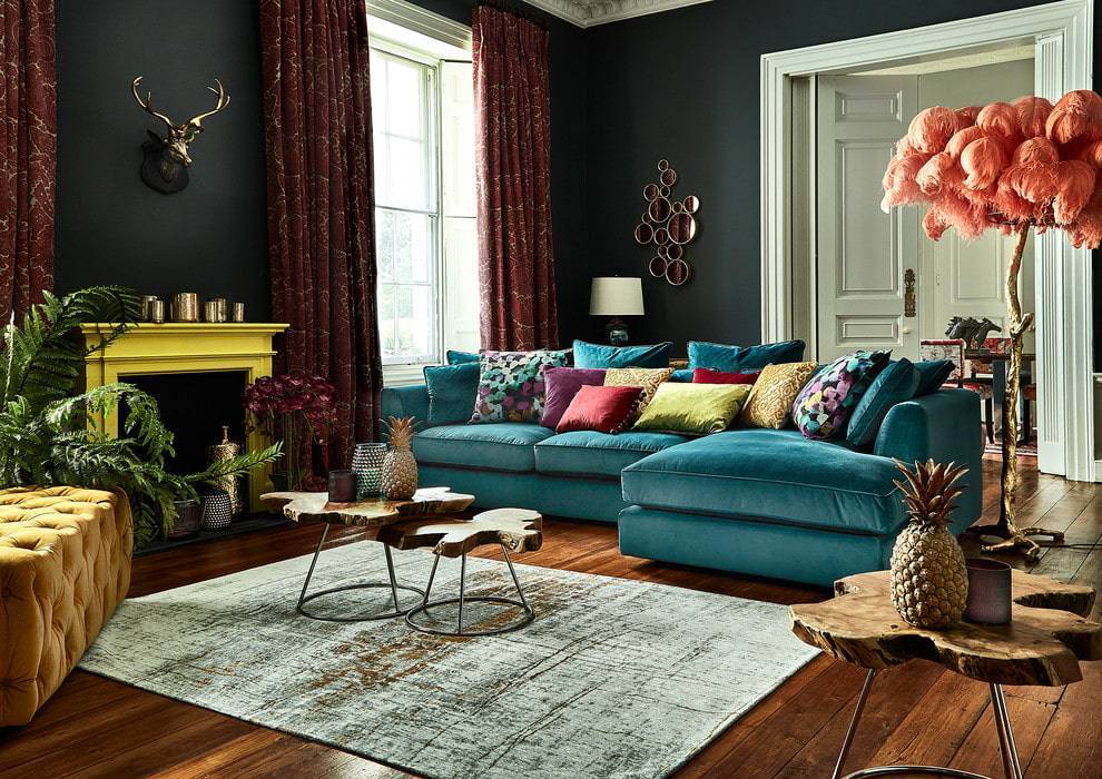 Есть более приглушенная вариация, с уменьшением яркости мебели за счет повторов этого оттенка в занавесках, абажурах на лампах и других элементах декора.