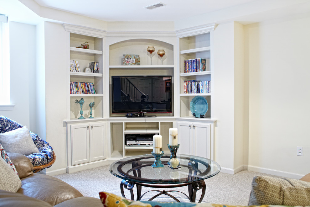 Для комнат небольшого размера лучше подобрать модули для угла: шкафы, комоды, стеллажи или тумбы под TV. В сочетании с ними хорошо будут смотреться подвесные полки, комоды и горки.