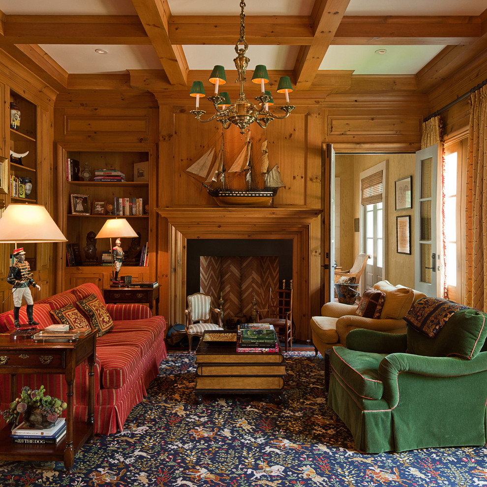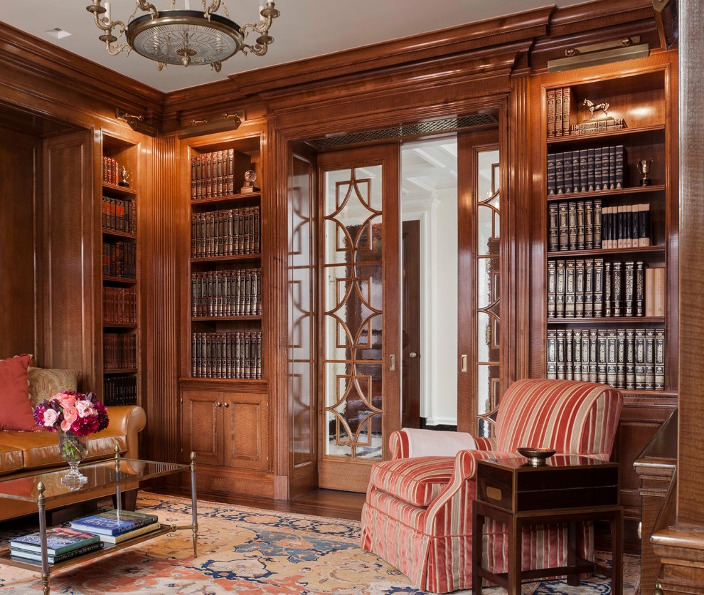 На фото интерьер зала в классическом стиле с высокой стенкой, выполненной из дерева.