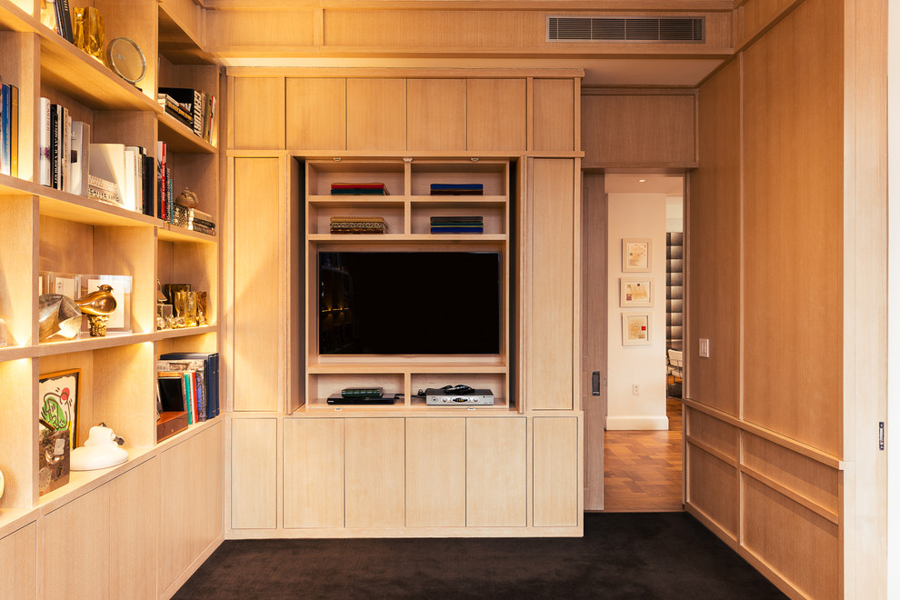 Мебель и отделка стен гостиной, оформленные одинаковым шпоном