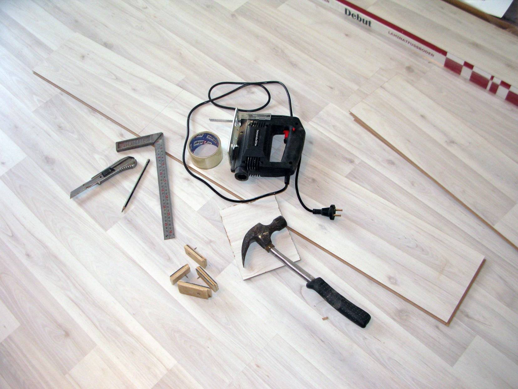 Сделать все правильно и согласно технологии, никак нельзя без подходящего инструмента. Первое что потребуется – это ножовка с мелкими зубьями, электролобзик и уровень. Ими можно подгонять ламинат по размеру. Для полного комплекта нужны рулетка и маркер.