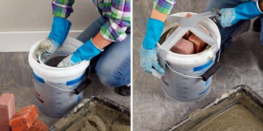 На дно большой миски наливают слой раствора толщиной 2-3 см, а затем вставляют в него ближе к центру емкости отрезки трубки. Когда раствор заметно схватится, миску меньшего размера ставят в большую емкость, сверху на трубки, а пространство между стенками заполняют оставшимся раствором. Чтобы миска внутри не сдвигалась при заливке, в нее кладут камень или кирпич. Верх раствора разравнивают кельмой и оставляют конструкцию на сутки.