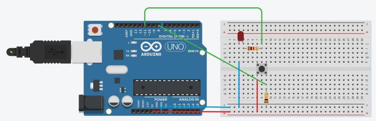 Давайте соберем первое устройство на базе Ардуино. Мы просто подключим тактовую кнопку и светодиод к ардуинке. Схема проекта выглядит так: