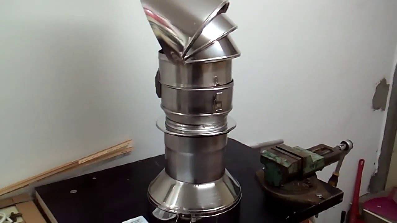 Такой дефлектор состоит обычно из двух цилиндров и укрепленных над ними конусообразных зонтиков. Функционирует он так: струи воздуха ударяется о стенку верхнего стакана, огибают его по бокам и заворачиваются вверх. В итоге движение воздуха в самой трубе становится более сильным, и увеличивается тяга в печи.