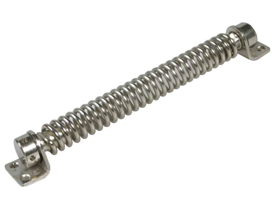 Первый и так называемый стандартный тип доводчика это доводчик накладной. Особой конструкцией он не обладает и представляет собой обычную накладную пружину (пружина спрятана внутри), которая привинчивается к двери самым простым методом — шурупами (другая часть соответственно к двери).