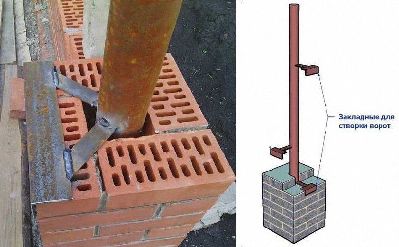 Столбы, куда навешиваются полотна, должны иметь внутри толстую трубу, которую устанавливают и выбирают по размерам. Кладка кирпичей представляет собой лишь оформление. Она не является несущей или крепежной.