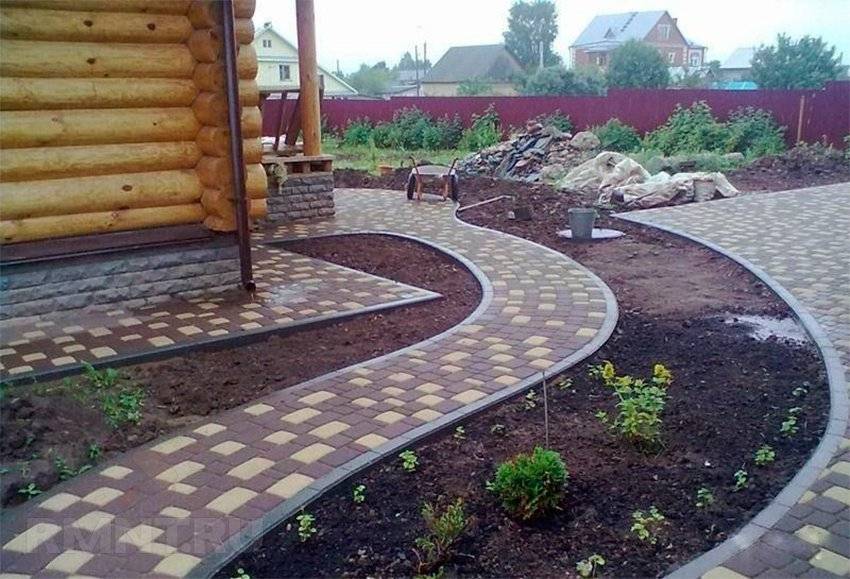 Желательно избегать сильно рельефной брусчатки и плитки сложной формы с большим числом толстых швов, неровными краями и скруглёнными углами. Идеально подойдут плоские камни толщиной в 40–50 мм с прямыми углами. Рекомендуется использовать плитку средних размеров: 12–15 шт./м2, приветствуется наличие фаски. Очень хорошо, если плитка будет закуплена ещё до выемки грунта — так вы сможете верно рассчитать отступ при установке бордюров и избежите ненужных подрезов.