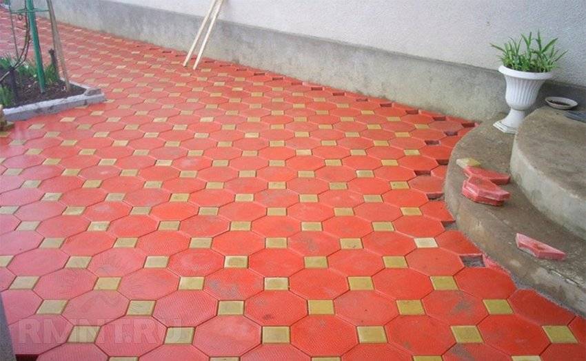 - Подготовка бетонного раствора. Как правило, он довольно жидкий, пропорции составляют 1 часть цемента на 4 части песка. Затем начинается укладка плитки на залитый раствор, начиная от фундамента и двигаясь к краю конструкции. Для фиксации и горизонтальности можно использовать крестики для керамической плитки, они создают необходимый зазор между плитами. При установке материалов нельзя забывать о создании небольшого уклона в сторону. Деревянную прокладку можно использовать вместо крестиков, но доски должны быть довольно тонкими и повторять профиль плит. Использовать ее можно только для нескольких плит одновременно.