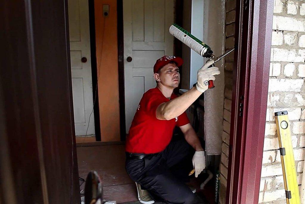 Не совсем традиционный вариант для утепления дверей, но который также обладает рядом положительных качеств и даже по некоторым показателям превосходит другие материалы. Первоначально для получения эффективного результата нужно уметь правильно пользоваться пистолетом для монтажной пены или поставляющейся в комплекте с баллоном трубочкой, благодаря чему удастся не только полноценно выполнить работы, но и избежать напыления чрезмерного количества излишков.