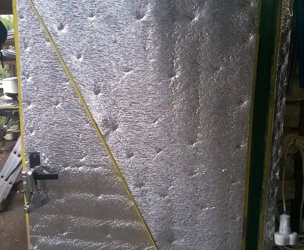 В полости железной двери по всему периметру крепятся деревянные бруски. Следующий шаг — создание между ними перемычек. При помощи жидких гвоздей к ним приклеиваются листы наполнителя. Швы обрабатываются жидким утеплителем.
