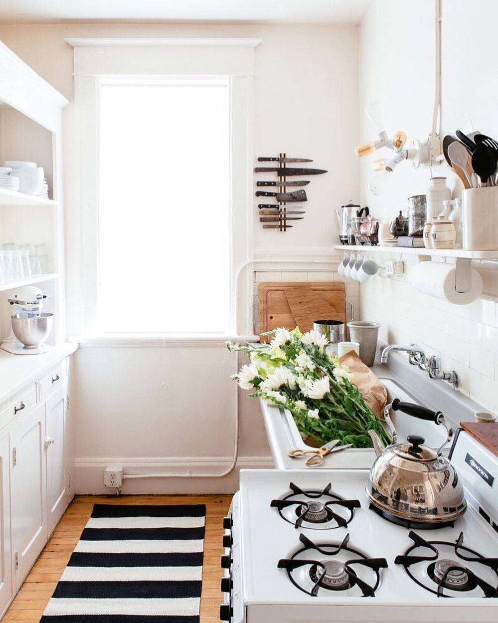 Если вы отказываетесь от навесных модулей, хранить некоторую посуду и готовить еду можно вблизи окна.