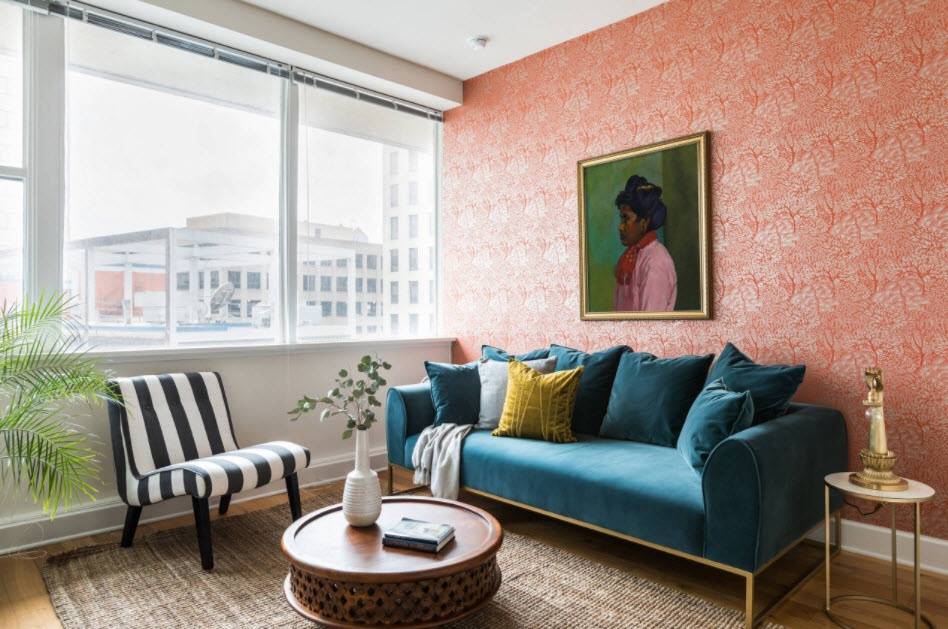 Фуксия, рыжий, бирюзовый и аналогичные тона пользуются популярностью. Здесь интенсивный цвет может стать основным, а дополнения универсального значения помогут создать гармонию обстановки.