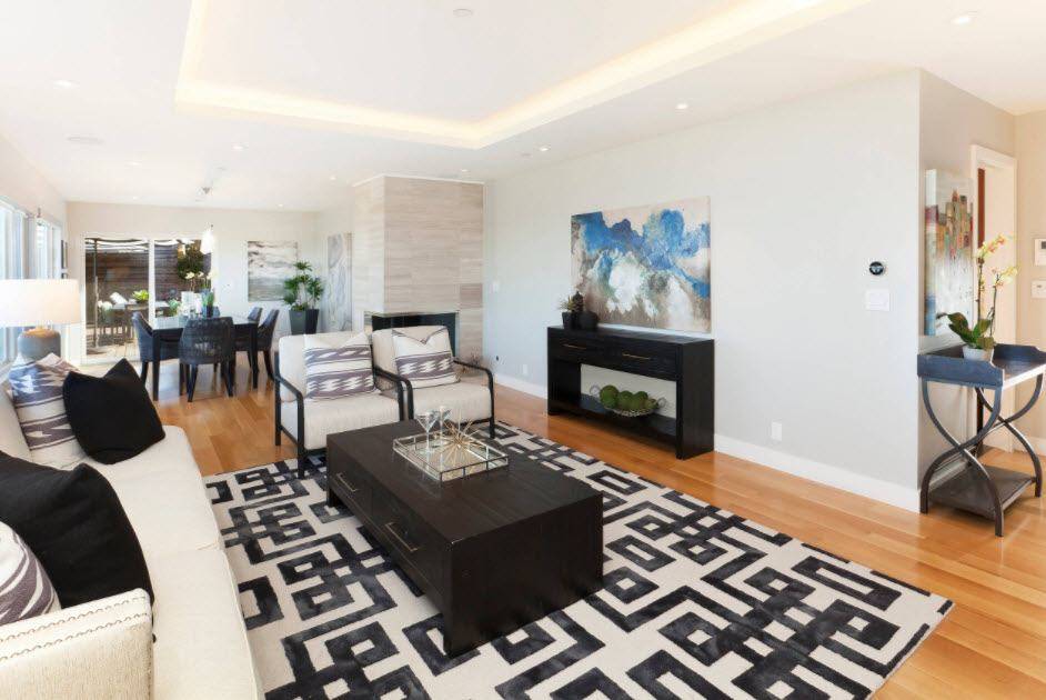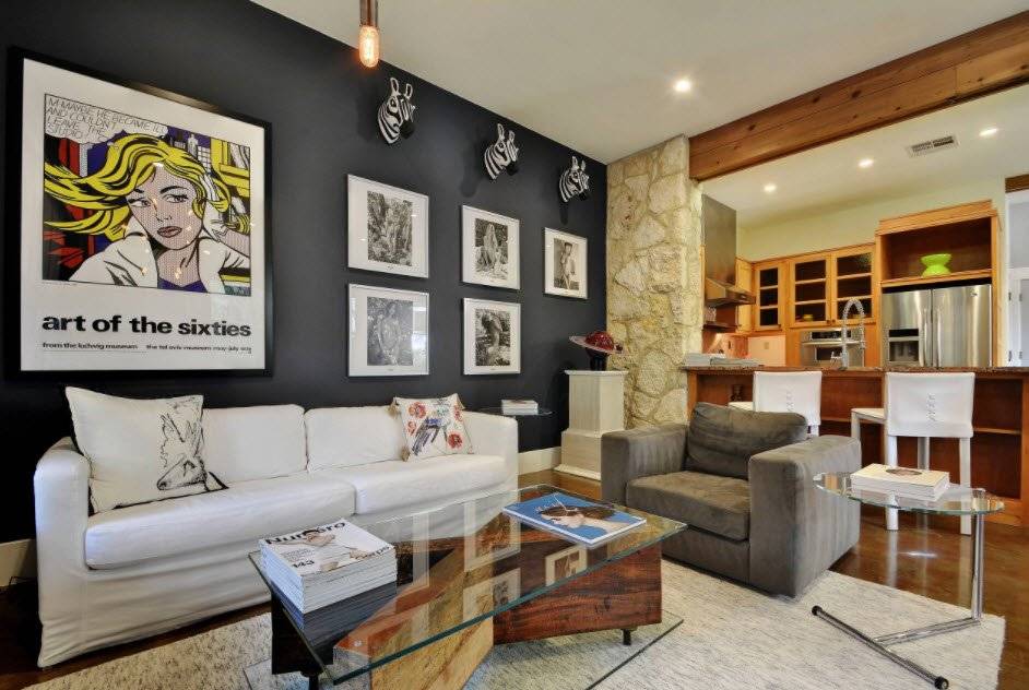 Одним из главных условий использования белого в интерьере является его обязательное разбавление другими цветами. Однотонная белая гостиная больше будет напоминать больничную палату или комнату, находящуюся в фазе ремонта. Чтобы этого избежать, необходимо добавить в обстановку цветную мебель, аксессуары, рисунки на поверхностях и даже оттеночное освещение. Белая база – это прекрасный способ дать волю фантазии и нанести на нее все свои пожелания.