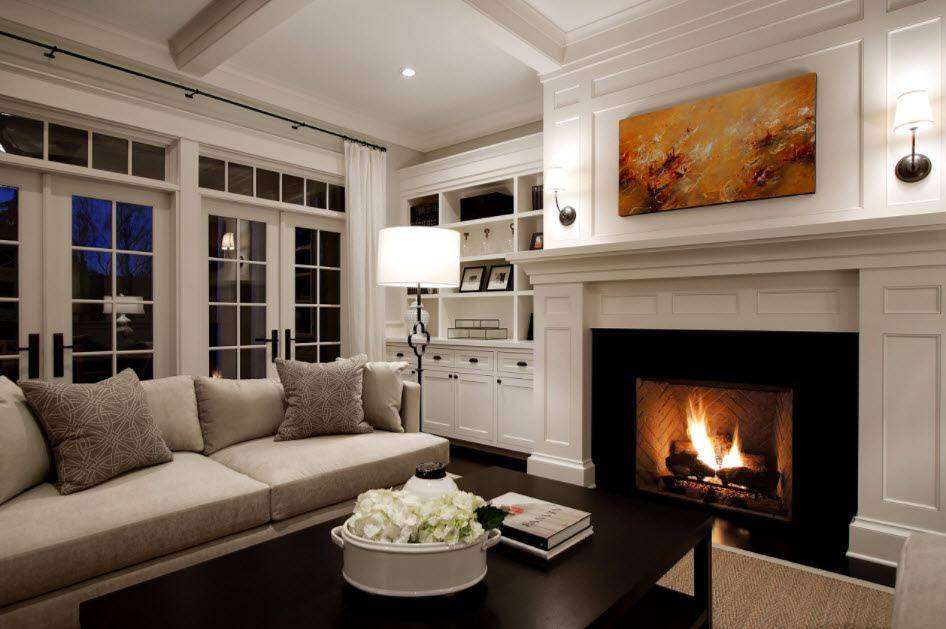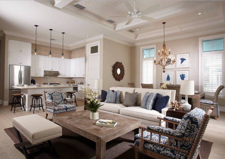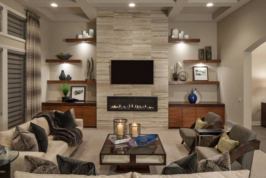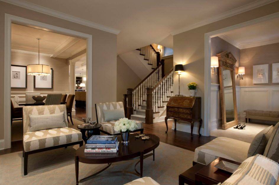 - Бежевые тона в широком диапазоне помогают сделать зал теплым и уютным. Они применимы для интерьера в любом стиле и гармонично сочетаются с яркими цветовыми пятнами любого спектра.