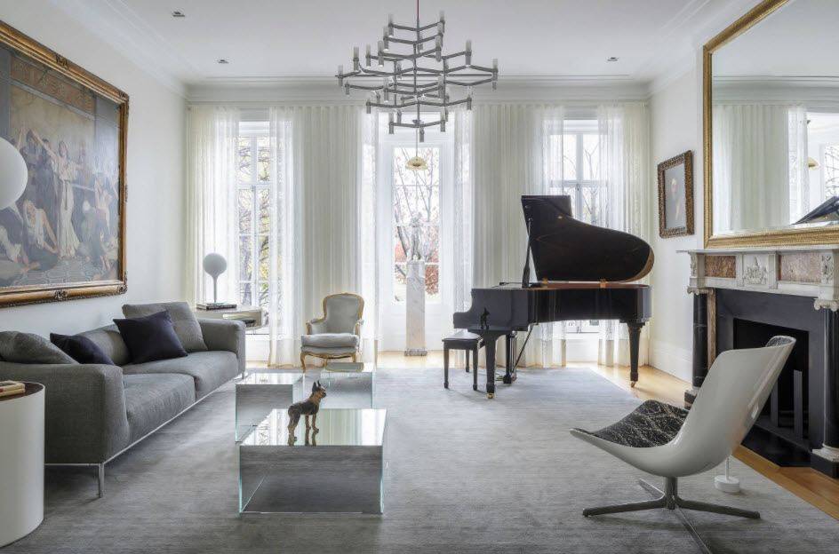 Классическое соединение голубого + серый уходит корнями в дворцовые интерьеры стиля барокко. Такая тенденция не выходит из моды, поскольку все созданное в прошлом остается с нами на генетическим уровне и включает необходимые струны души. В результате нет взрыва красок, но есть благородство линий и сдержанная фешенебельность. Бирюзовая обивка мебели, декоративные подушки расставляют необходимые акценты и добавляет веселые нотки.