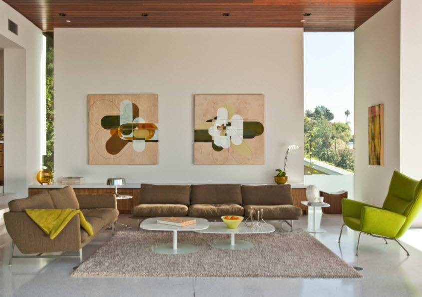Монохромный вариант отделки предполагает использование в дизайне гостиной оттенков одного цвета. Их может насчитываться от нескольких десятков до нескольких сотен. Так, среди оттенков зеленого есть 376 тонов. И каждый из них имеет свое название, например, цвет лесной тени, жасминово-зеленый, бледно-лаймовый и другие. Но используются в отделке интерьеров далеко не все.