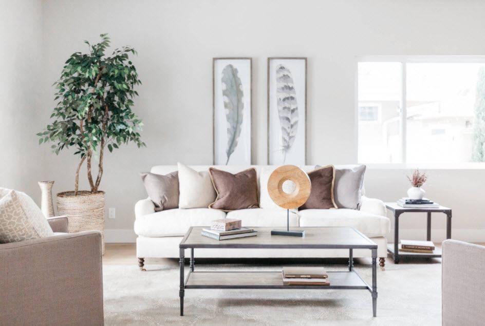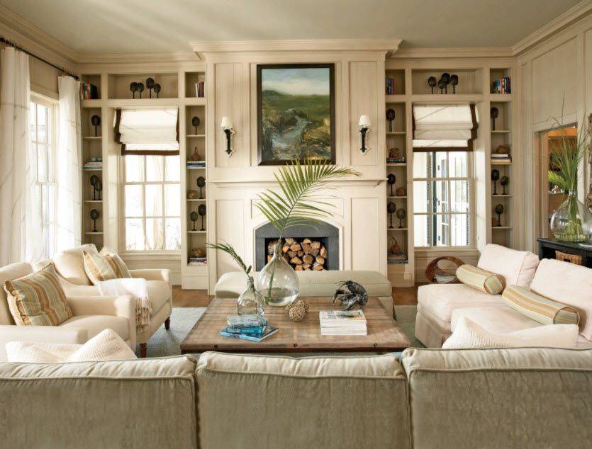 Монотонная схема выбирает нейтральные оттенки. Подобные гостиные выглядят стильно и утонченно, но в них обязательно используются яркие акцентные решения: картины, шторы, один элемент мебели, например, кресло.