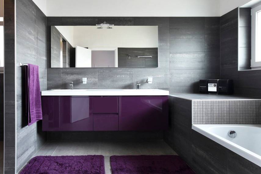 Выразительно смотрится интерьер ванной, где преобладают фиолетовые оттенки