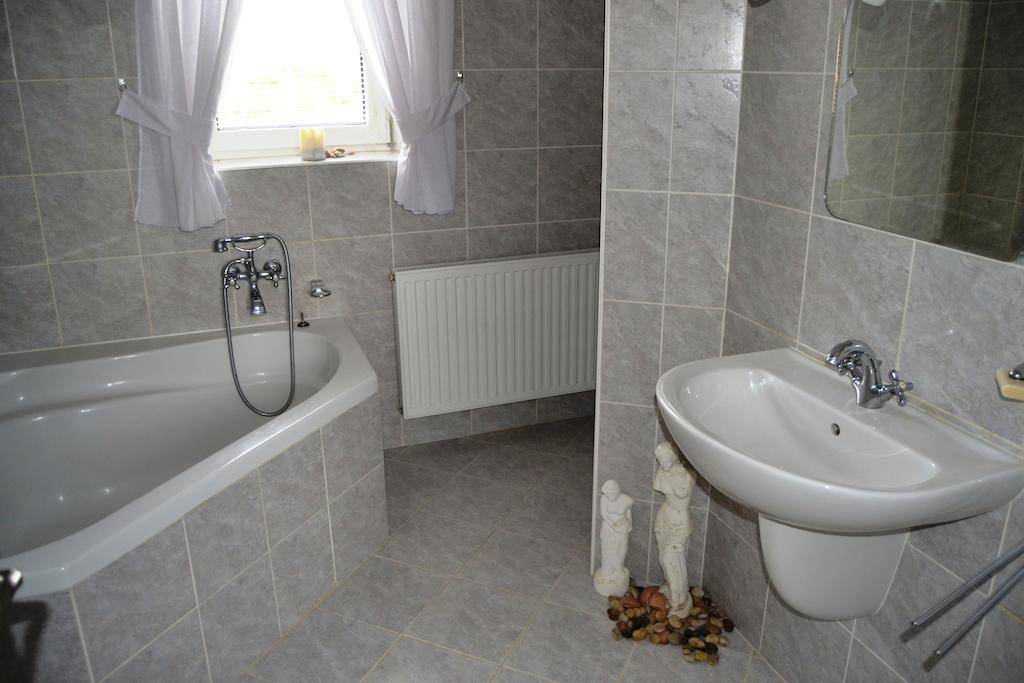 Иногда в интерьере санузла можно встретить и окрашенную в различные оттенки зелени чугунную ванну.