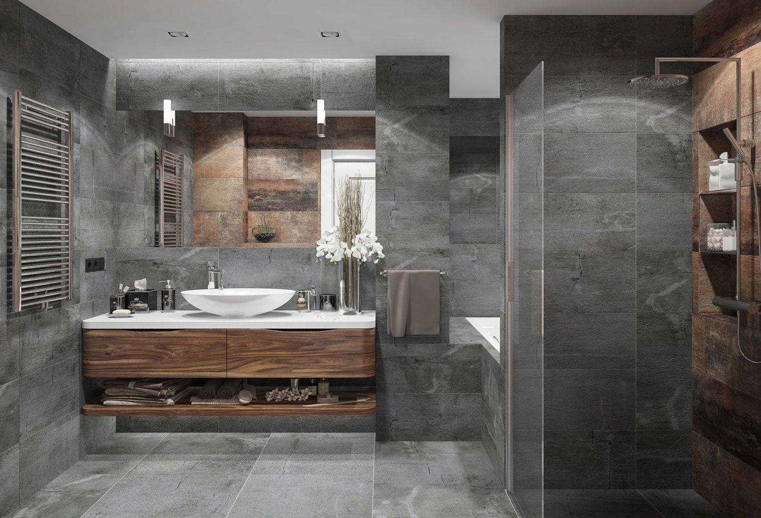 На первый взгляд темно-серый — смелый выбор для ванной комнаты. Расцветка окутывает комнату как кокон. Мягкий и современный темно-серый цвет сочетается со многими стилями. Современным дизайнерам интерьеров нравится подчеркивать его прочность цементной плиткой с графическим рисунком или штрихами черного цвета. В ванной комнате есть все, что подчеркивается декоративным предметом из меди или латуни.