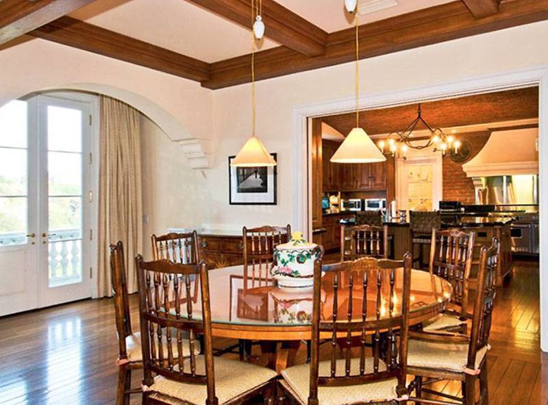 Колониальный стиль в обеденной зоне подчеркнули массивными потолочными балками из натурального дерева. По центру комнаты поставили круглый стол из массива, столешница которого защищена прозрачным стеклом. Вокруг разместили классические стулья с высокими деревянными спинками.