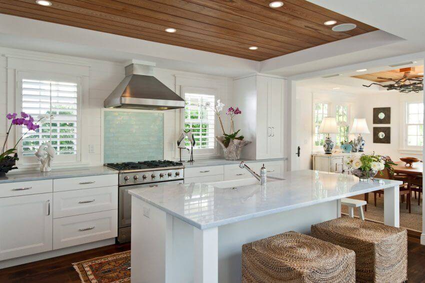 Белоснежный потолок имеет и свои минусы, устранить которые легко. Например, если вы планируете такую отделку в столовой, на кухне или мансарде, то разбавить белое полотно можно массивными балками из темного дерева. Это создаст цветовой контраст и в итоге придаст помещению оригинальный вид. В идеале балки должны быть точно такого же оттенка, что и пол.