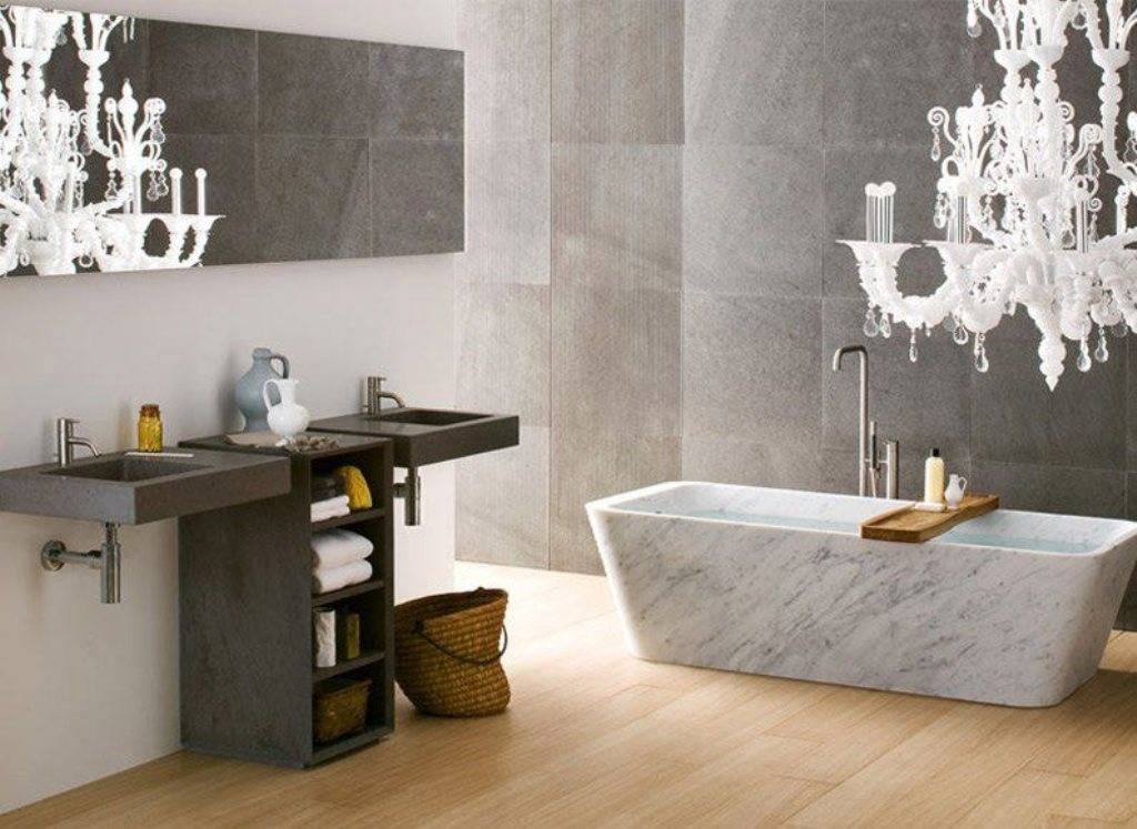При установке ванны из литого мрамора обеспечивается гармоничное сочетание внешней отделки резервуара и стен помещения. Например, на внешней части изделия серии York от Victoria Albert нанесен орнамент, опоры закрываются экраном светлого цвета. Владелец квартиры или дома может самостоятельно менять рисунок, используя оригинальные перламутровые краски и трафарет. На полу и стенах уложена кафельная плитка с затиркой швов мастикой, цвет которой соответствует оттенку декоративного рисунка на боковине ванны.