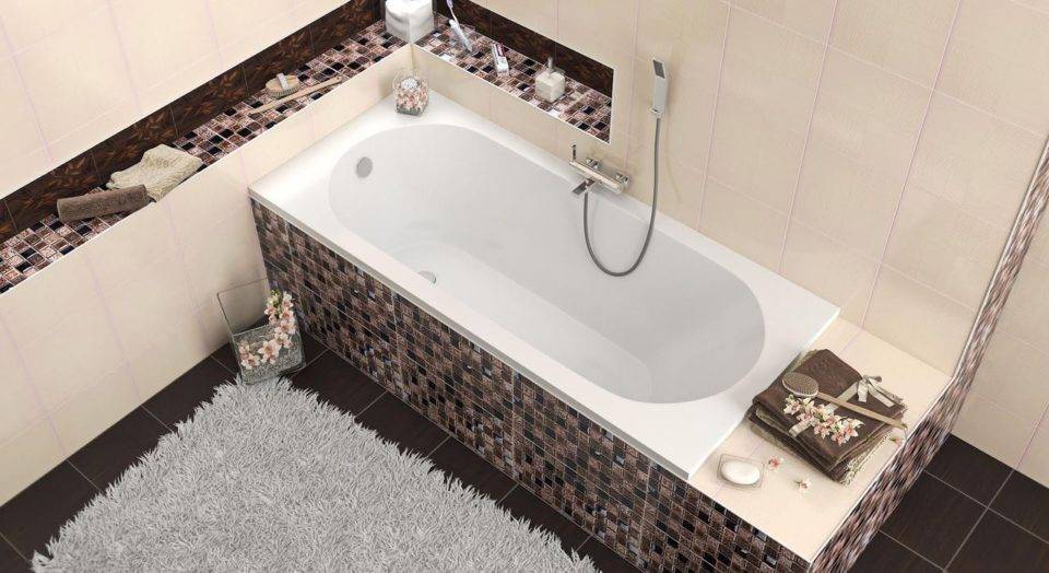 Прямоугольную ванну можно установить вдоль стены или в угол помещения, проем закрывается экраном с мозаичной плиткой. Цвет отделки соответствует оттенкам кафельной плитки на полу и стенах помещения. Смеситель с душевой лейкой встраивается в перегородку. По периметру ванны крепится направляющий каркас с матовыми ударопрочными стелами, защищающими помещение от воздействия брызг воды.