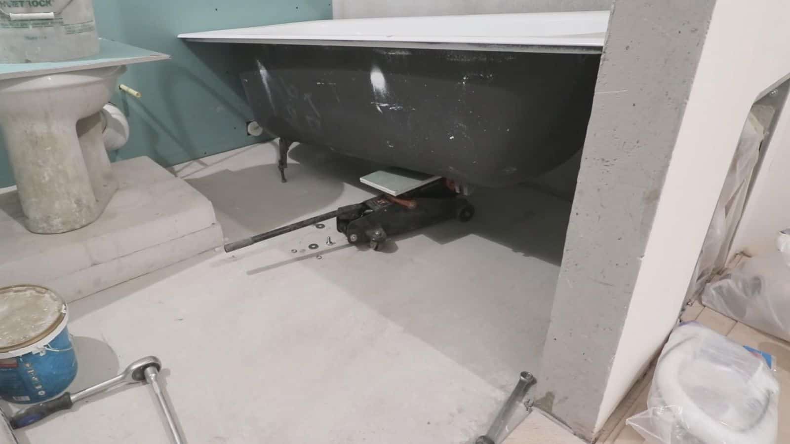 Сначала ванну необходимо установить на временных подпорках.