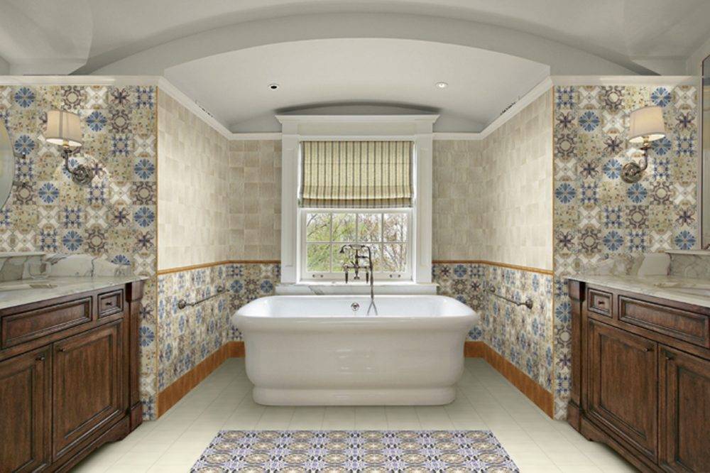 Плитка для ванной комнаты под камень благодаря неровным краям требует подбора формы смежных элементов, что сильно замедляет и осложняет ее укладку.