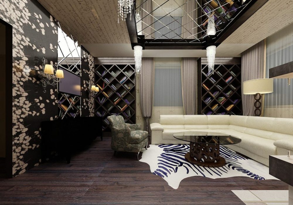 - ар-деко – отделка стенок узорчатой плиткой с золотыми узорами, золоченая пластиковая лепнина на потолке, обилие черно-коричневых элементов, пол из натурального камня;