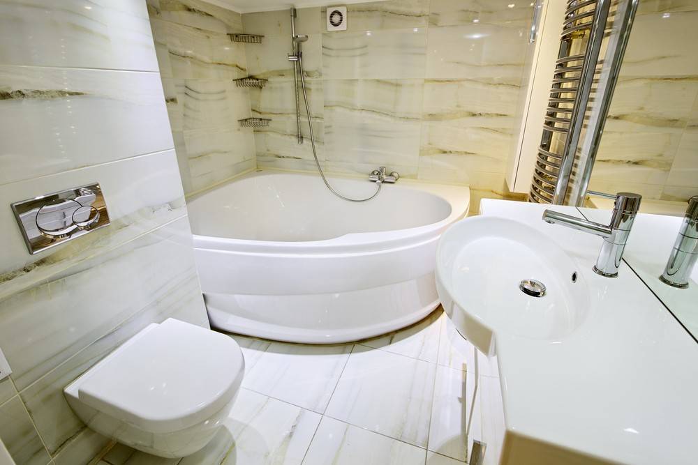 В левом углу – полноценная ванна, которая может быть средних размеров, что довольно удобно.