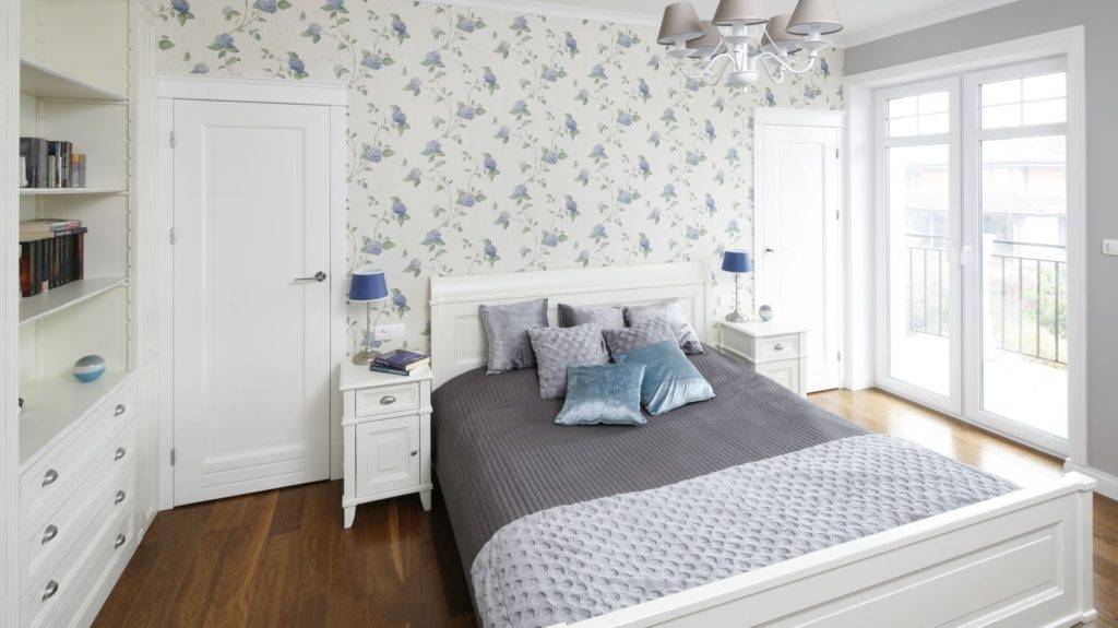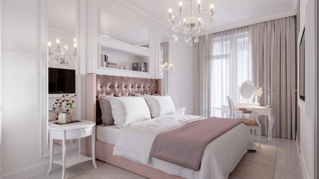 Мерцающие лампы, элегантное изголовье, приглушенные цвета подойдут для декора спальни во французском стиле