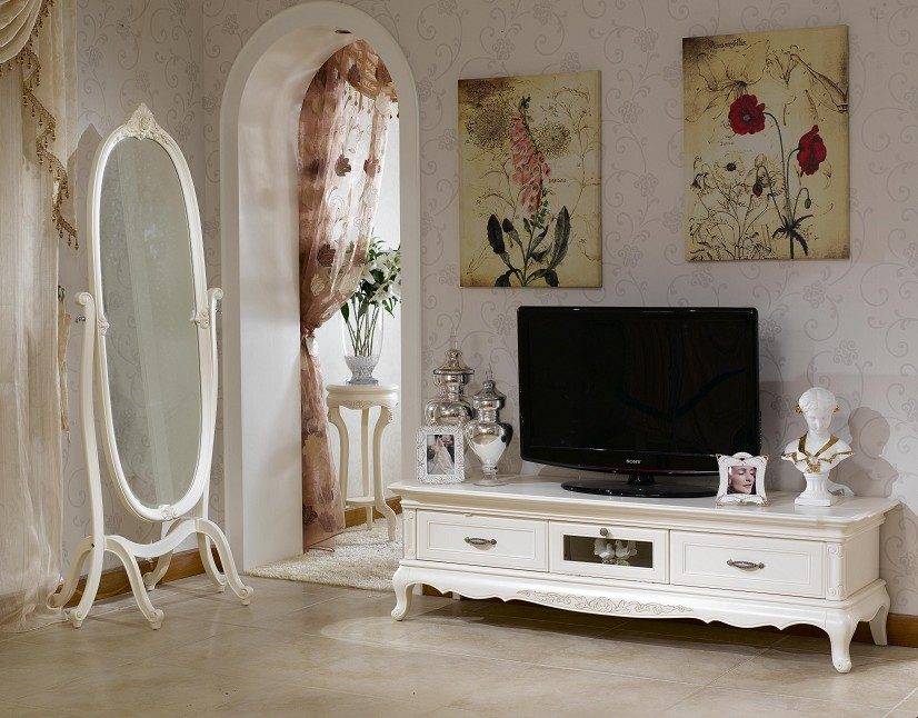 - Фурнитуру следует состарить искусственно, придав ей патину. Выглядеть она будет эффектно. Зеркало в массивной раме над туалетным столиком – выразительный акцент стиля.
