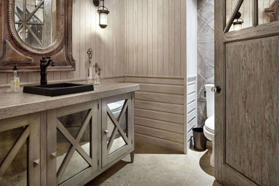 Отделка в деревянном доме в ванной комнате подразумевает ряд работ по защите строительных конструкций и созданию эстетического внешнего вида. Основная сложность — новый дом из бруса подвержен усадке.