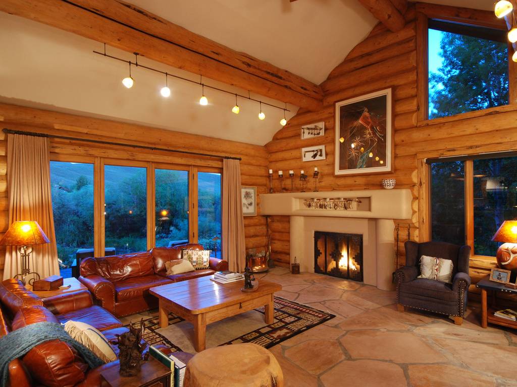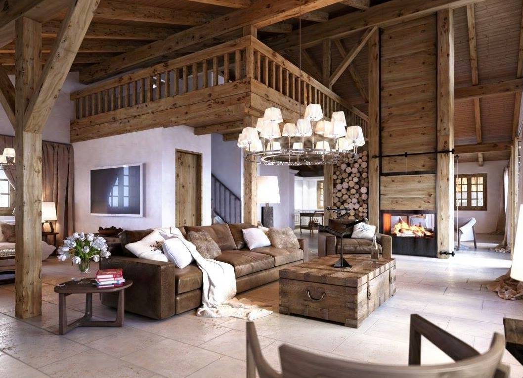Отличным дополнением шале будет декор в виде ковров, изготовленных из шкур, или охотничьего оружия. Альпийский домик оборудуют с помощью массивной мебели с обивкой выполненной из натурального кожаного материала или качественного кожзама.
