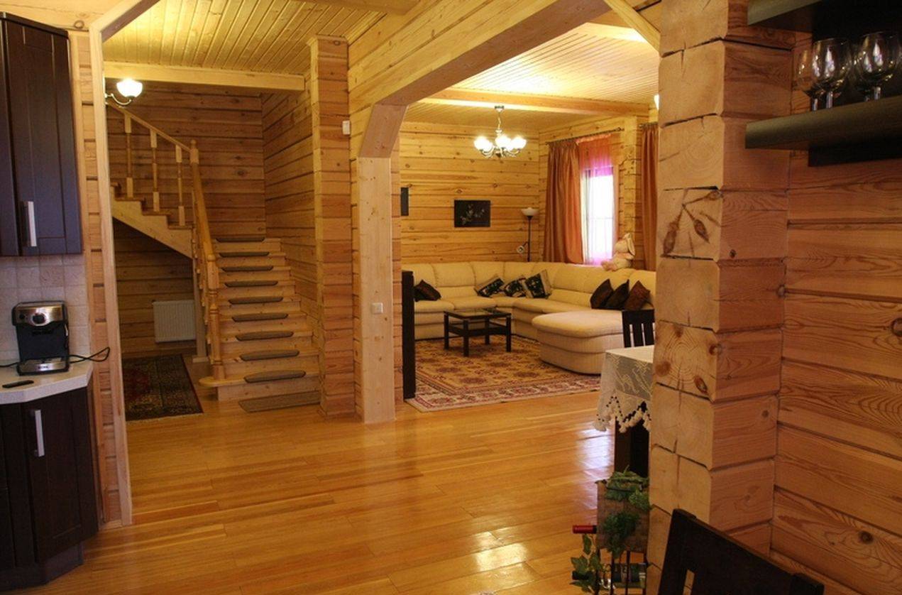 На фото интерьер дома в русском стиле, выполненного из крупного бруса.