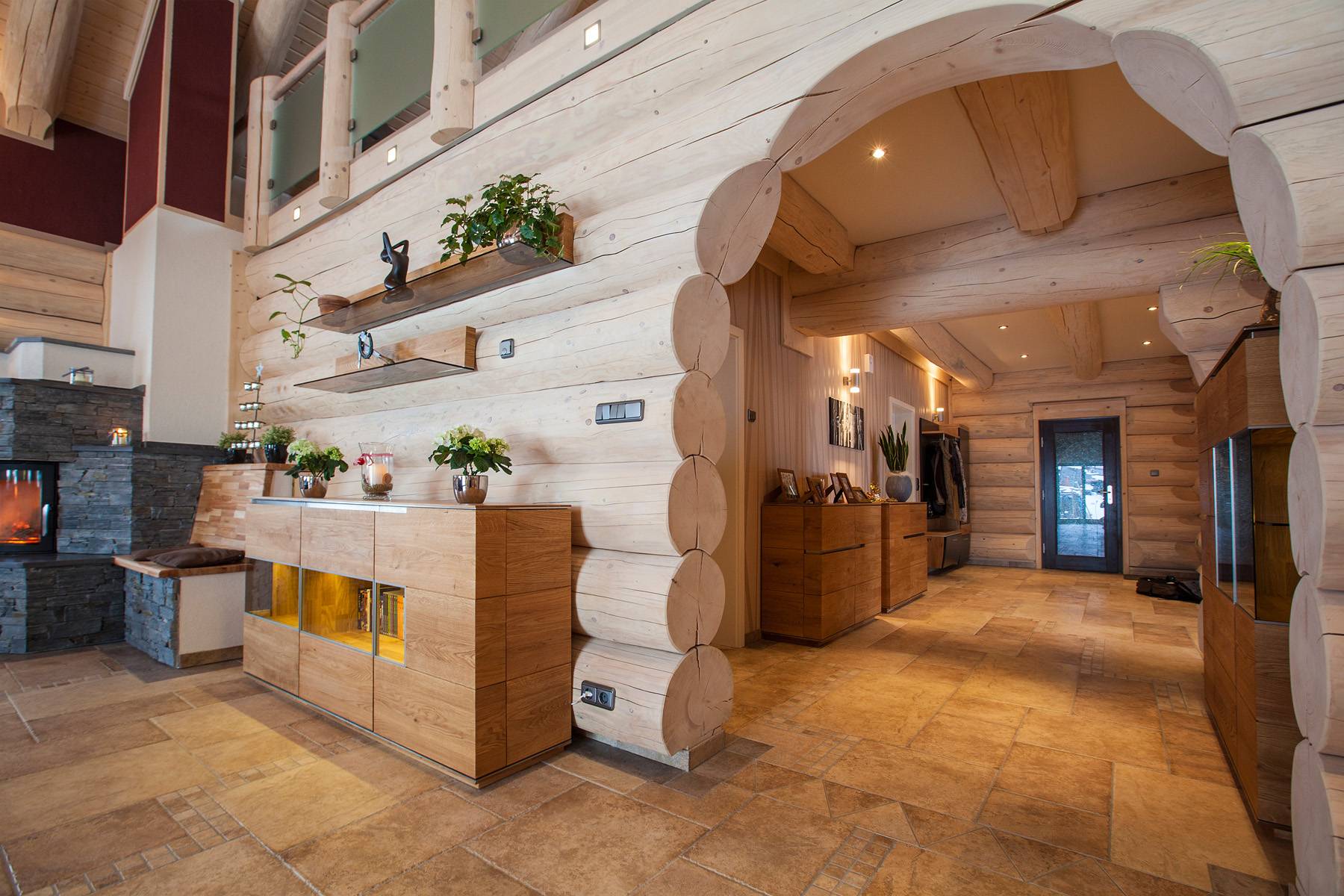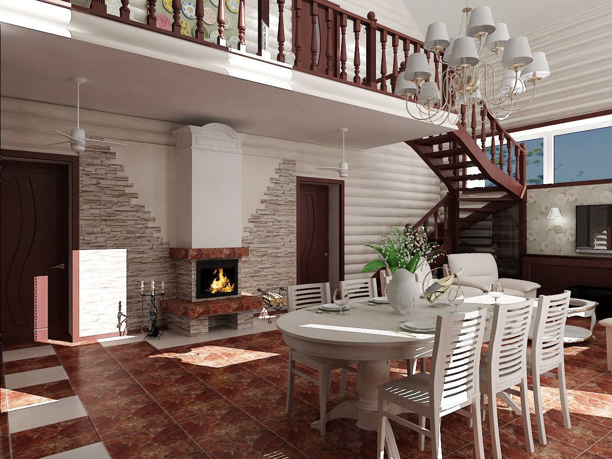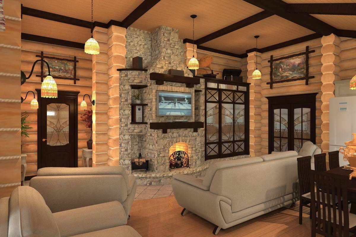 Ключевым интерьерным элементом может стать камин с расположением вдоль стенки или по центру помещения. Очаг в основном облицовывают природным камнем, гармонично сочетающимся с брусом. Для отделки пола используется матовые или полуматовые доски с эффектом состаривания.