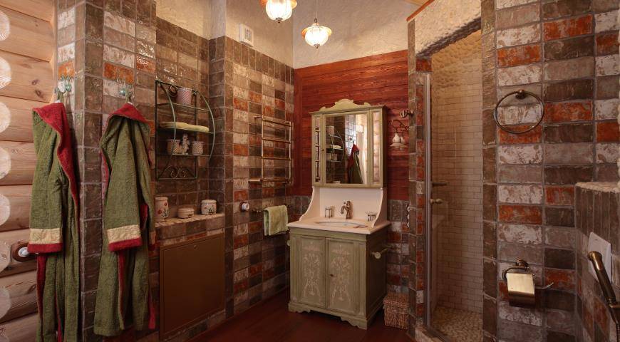 2. Дизайнерские решения ванных комнат в деревянном доме разнообразны и зависят от конкретного проекта и используемых материалов. Прием, который мы советуем использовать, – не зашивать все стены керамической плиткой и не делать санузел, как в квартире. Определите основные зоны попадания влаги: душ, умывальник, места расположения сантехнических приборов. Определите оптимальную высоту для укладки плитки. Например, стену за умывальником можно зашить и уложить плитку на высоту около 1100 – 1200 мм от пола, в душе – около 2000–2100 мм от пола. Остальные стены помещения оставьте в дереве, но обработайте специальной антисептической влагоотталкивающей пропиткой. Такое дизайнерское решение в сочетании с правильно подобранной плиткой будет смотреться очень красиво и сразу создавать настроение уютной загородной жизни.