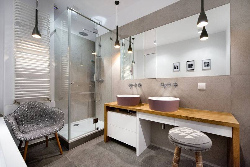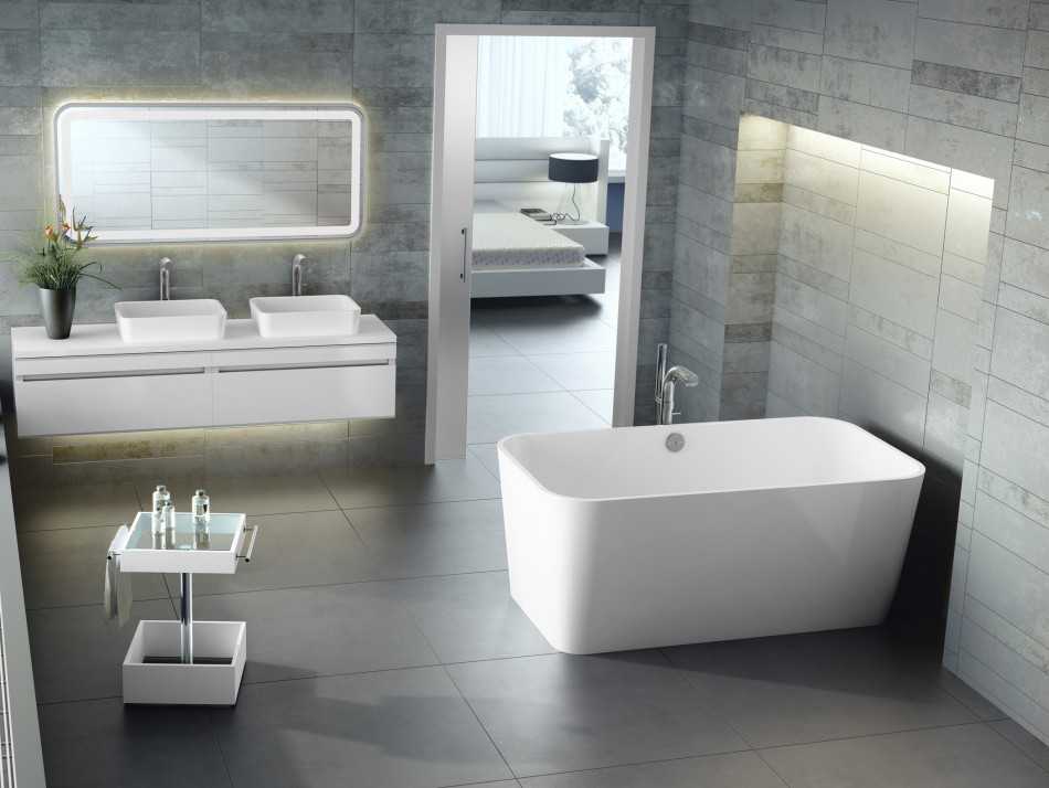 В случае большой ванной стоит выбрать отдельно стоящую ванну. Если размеры комнаты этого не позволяют, хорошей альтернативой станет ванна геометрической формы или современная стеклянная душевая кабина, желательно с гидромассажем или даже радио.