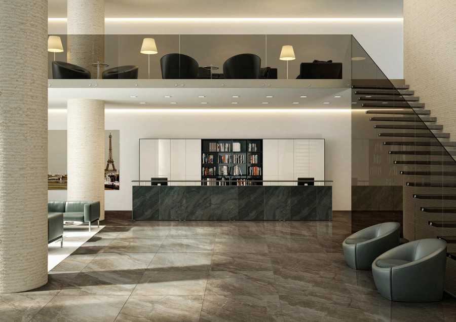 - Хорошим решением также является современная плитка, внешняя оболочка которой сделана из натурального камня толщиной 3 миллиметра. Под ним находится сердечник толщиной до 9 миллиметров, сделанный из алюминия, оргстекла или керамогранита. Такая плитка до четырех раз легче своих мраморных аналогов!
