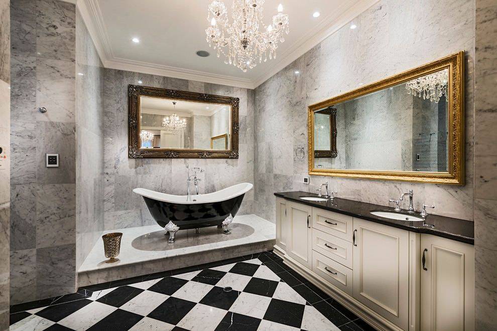 Классические интерьеры позволяют использовать камень в полном объеме. Мраморная плитка в ванную может использоваться в отделке пола и стен. Если нужно сделать помещение более уютным, можно комбинировать камень с деревянными покрытиями.