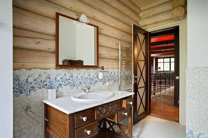 Вообще, использовать можно любые отделочные материалы пригодные для ванных комнат. Просто мало это практикуется — натуральная древесина стала слишком редким отделочным материалом, чтобы в деревянном доме использовать привычные обои или краски. Влагостойкими материалами можно облицевать только нижнюю часть