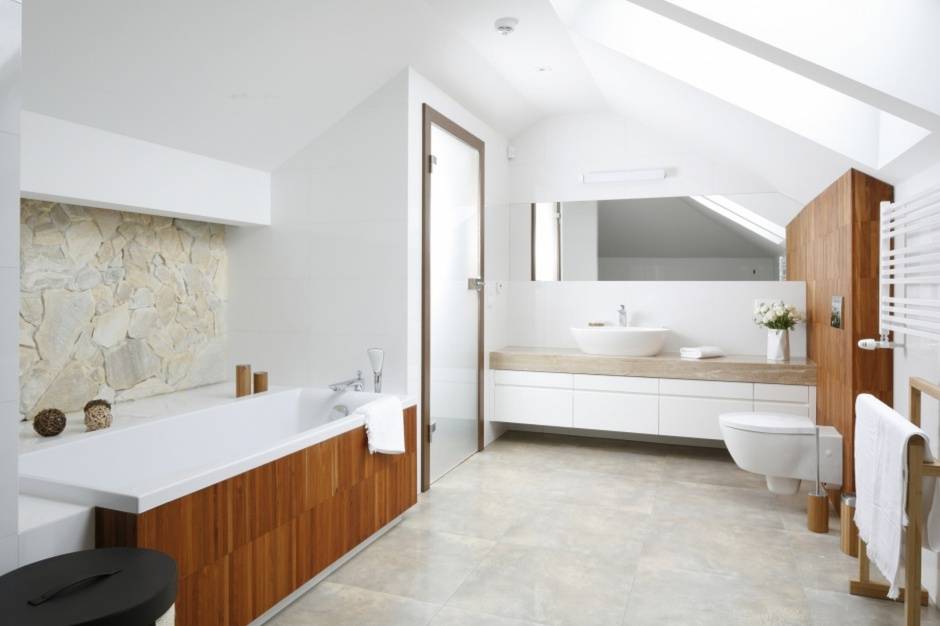 Ванную под мансардной крышей можно сделать в любом стиле, несмотря на ее необычный вид и скошенные стены.