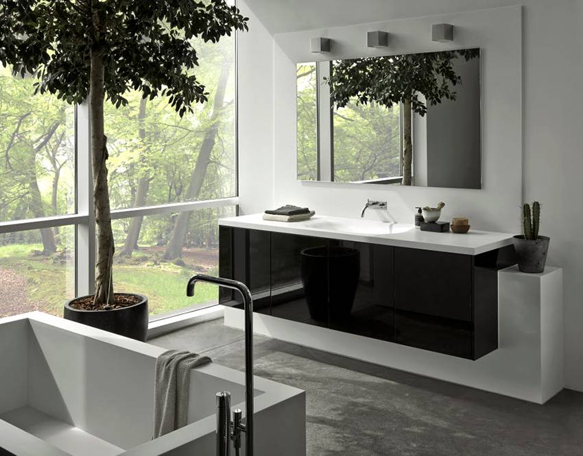 Белые стены и черный пол – очень популярный тандем, имеющий много сторонников и почитателей. Такое сочетание весьма типично и традиционно для скандинавского стиля в интерьере ванной комнаты. Белые стены могут быть оформлены как плиткой, так и штукатуркой, покрытой специальной краской.