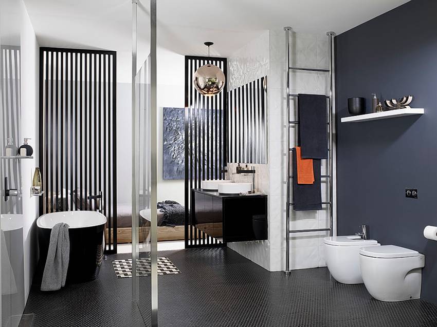 Сантехника должна быть качественной и не резонирующей с общей отделкой пространства. Если, допустим, у вас плитка, которая делает ванную похожей на стилистику 70-х, то унитаз и ванна не должны быть слишком футуристичными на этом фоне (то есть все должно быть в духе одного времени). Присмотритесь к навесным унитазам: это и эргономично, и модно, и современно.